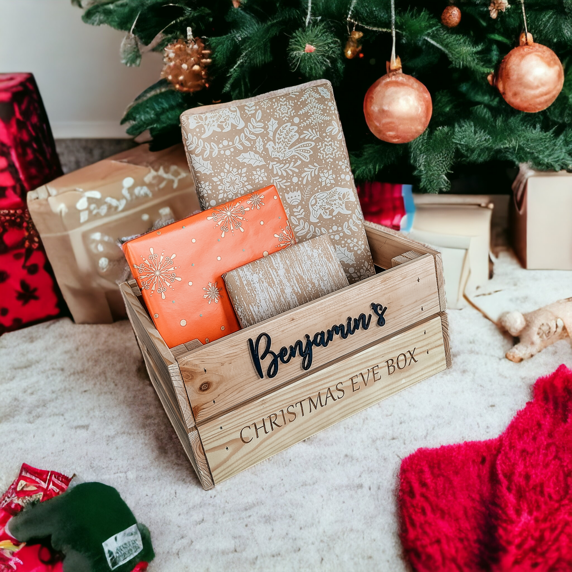 This customizable touch adds a unique and personal flair, making it a perfect keepsake or a thoughtful gift. Ideal for filling with cherished items like Christmas pajamas, snacks, or small gifts, our Personalized Christmas Eve Crate creates a magical and memorable experience for the entire family. Elevate your holiday celebrations with this enchanting and customized keepsake crate.